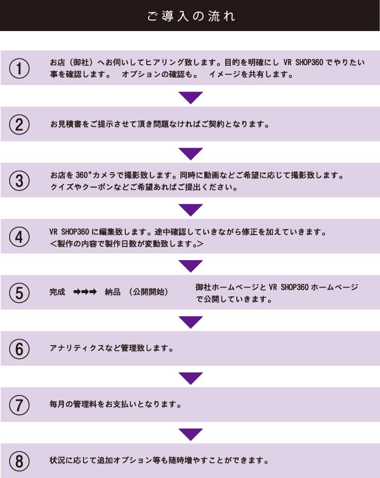店舗ビジネスを営む方へ向けた販路拡大のWEB上のお店です。お客様がVR SHOP 360に訪れ楽しみながら回遊して頂き商品を確認でき気に入ればそのまま購買、若しくは実店舗に来店して頂く為にご活用頂けます。様々な仕掛でお客様をあなたのお店へ誘導する為の来店欲求を起こさせます。まずは下のデモ店舗で新たな面白さを体験してください。